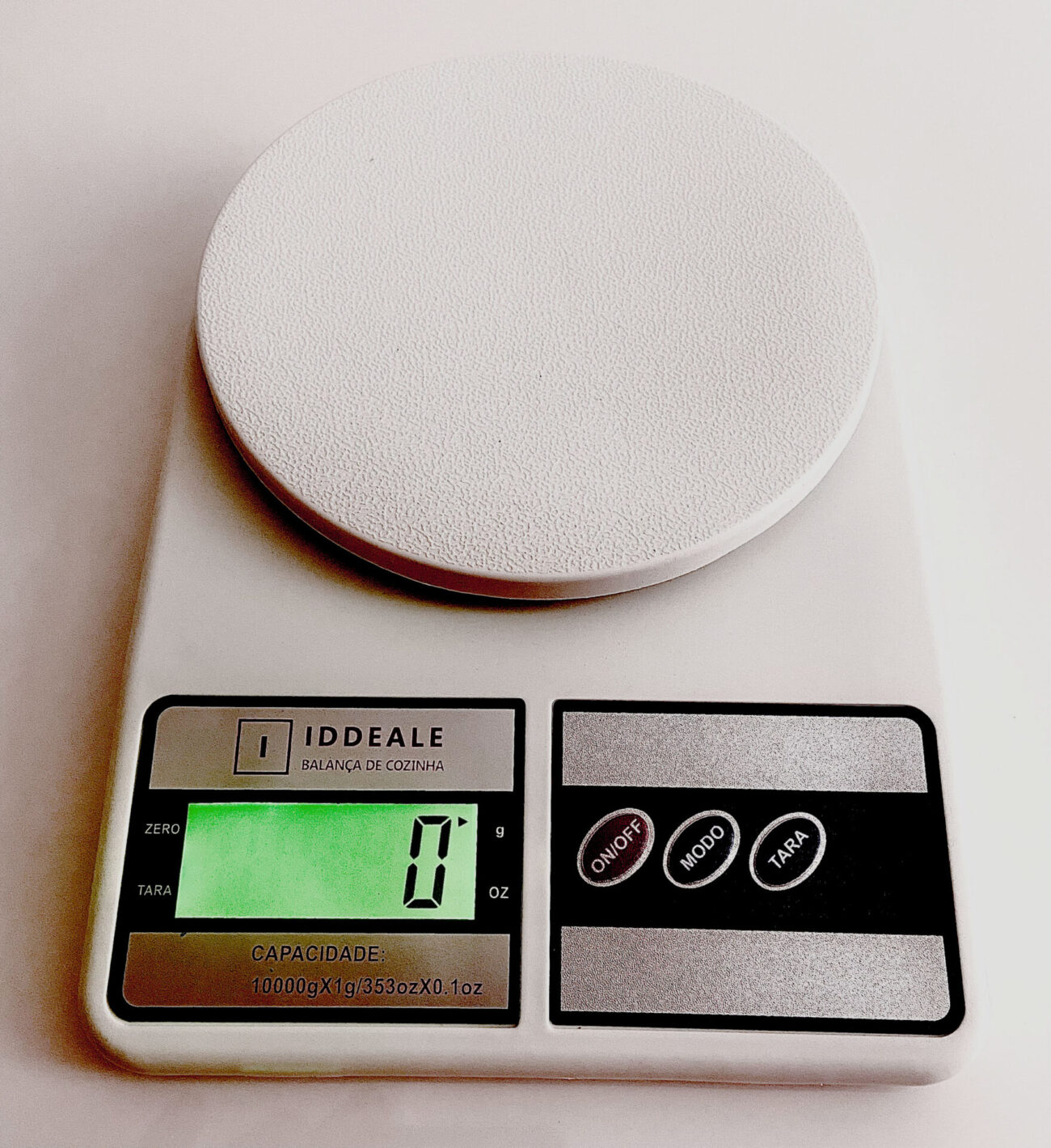 Balança digital de alta de precisão. Pesa até 10kg, com precisão de 1g em 1g.